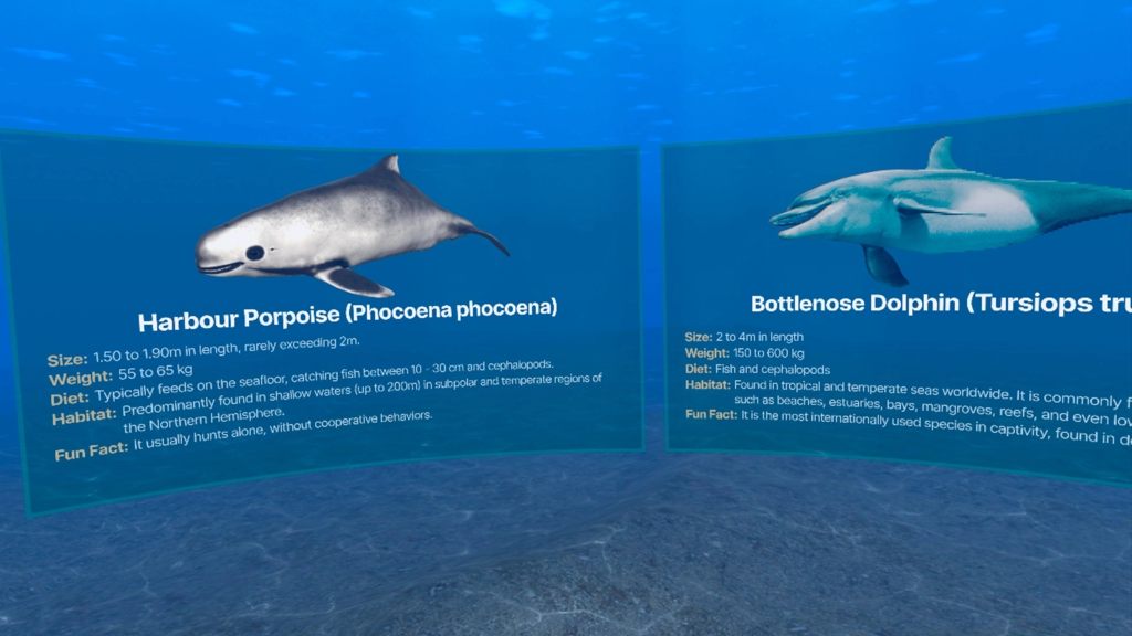 Fred:我们为 SOMAR 项目打造的 XR 体验是一款沉浸式教育工具,旨在提升用户对水下噪音污染对海洋生物影响的认知。通过高度真实的阿尔加维近海与远海环境模拟,用户可以亲眼看到旅游船只(特别是观鲸和观海豚活动)产生的噪音如何干扰这些重要海洋哺乳动物的交流与捕食行为。我们希望通过这种交互式体验唤起用户的情感共鸣,提升保护海洋生物及其栖息地的意识。