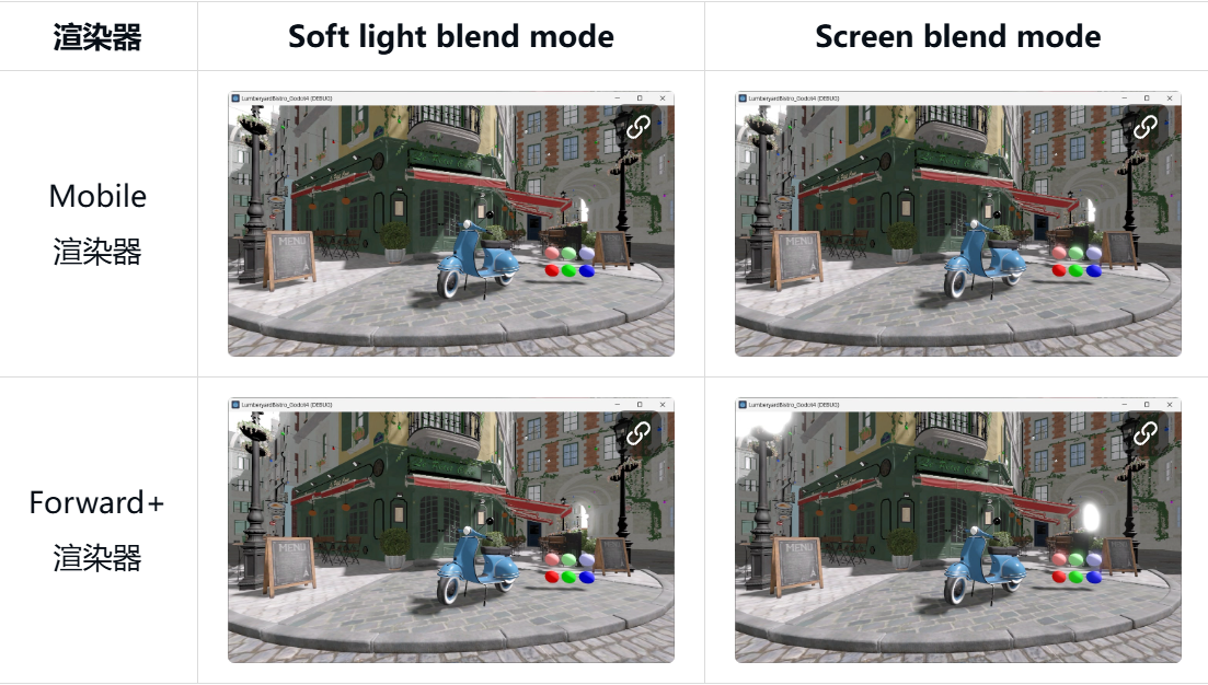 第一项更改是在所有渲染方法与混合模式下(除 soft light 外)在色调映射之前混合辉光。此前该行为仅在兼容性渲染器中存在,现在已扩展到 Mobile 与 Forward+ 渲染器。