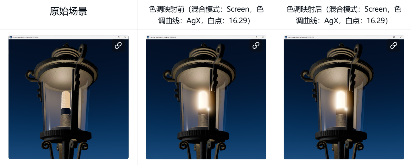 第二项更改是将所有渲染器的默认辉光混合模式从 soft light 改为 screen。这同样与兼容性渲染器保持一致,其默认值是基于“先混合后色调映射”的逻辑设定的。